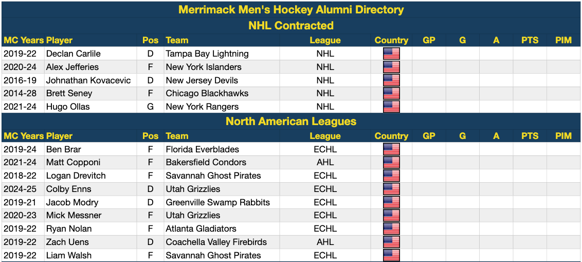 Every player still active in college or professional hockey who spent at least one season at Merrimack is included.