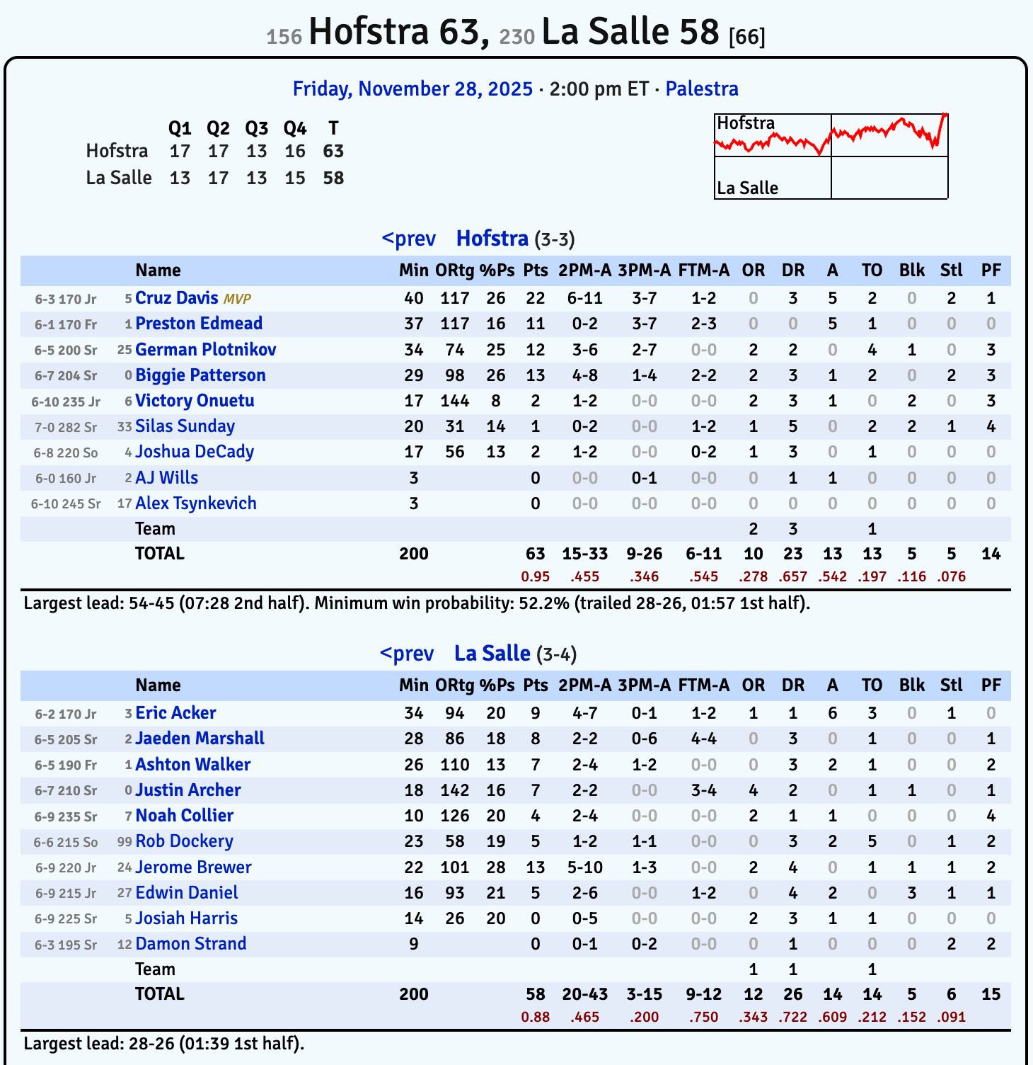 Merrimack will be back on the floor Saturday at 2 p.m. against Hofstra. The Pride opened their weekend with a 63-58 win over La Salle on Friday, paced by 22 points from Cruz Davis.