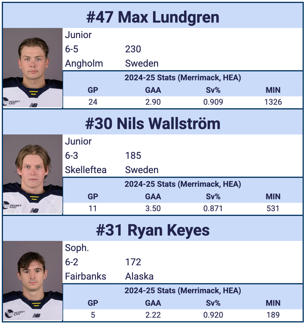 First up: the goaltenders. All three saw time in the net last season and, at least in stretches, have established themselves with proven résumés at the Division I level.