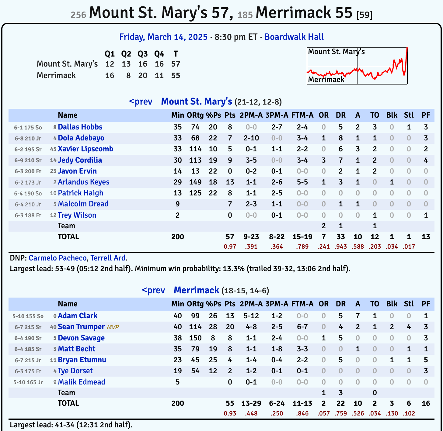 Trumper scored a game-high 20 points for Merrimack and had five rebounds.
