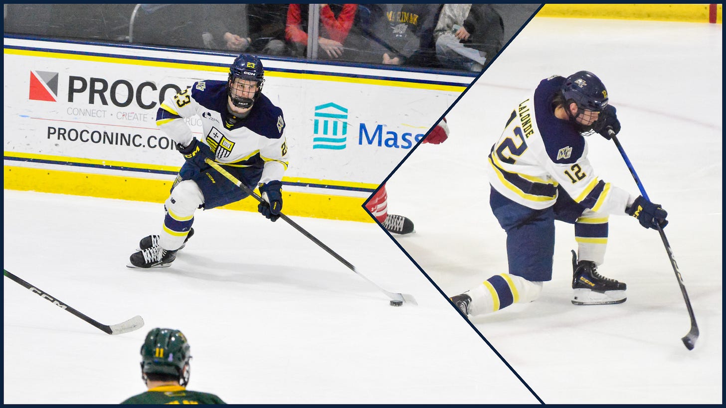 Lalonde and Gill enter tonight’s Hockey East first-round matchup against UMass Lowell as Merrimack’s leading scorers, tied with 32 points. Lalonde has 12 goals and 20 assists through 33 games, while Gill has recorded 16 goals and 16 assists in 31 games.