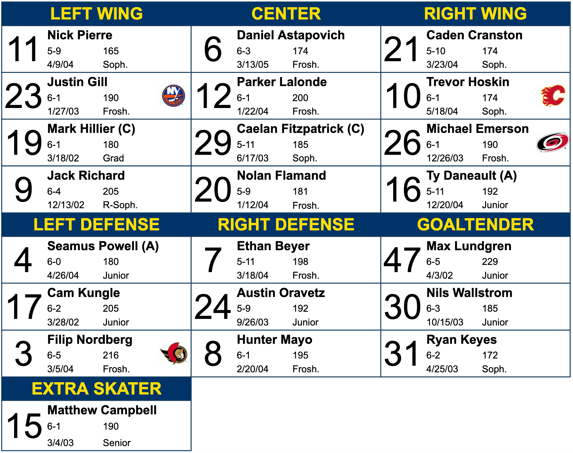 The Warriors have made only two lineup changes. Sophomore captain Caelan Fitzpatrick returns after missing last Saturday’s game against Long Island with an undisclosed injury. On defense, Ethan Beyer draws back into the lineup and will be paired with Seamus Powell.