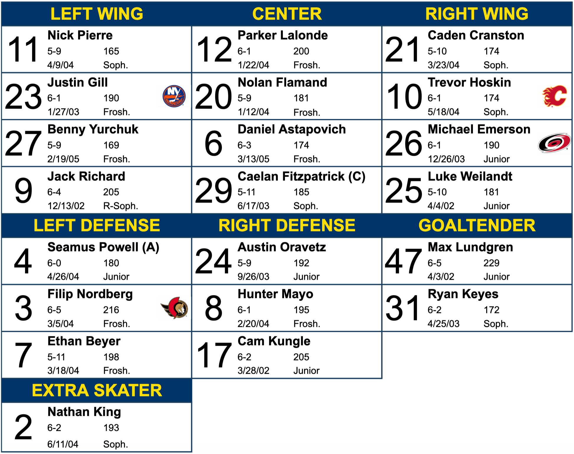 Forward Ty Daneault remains unavailable for Merrimack; he has been sidelined with an injury. Nathan King and Jack Richard return to the lineup, while Max Lundgren is expected to get the nod between the pipes.