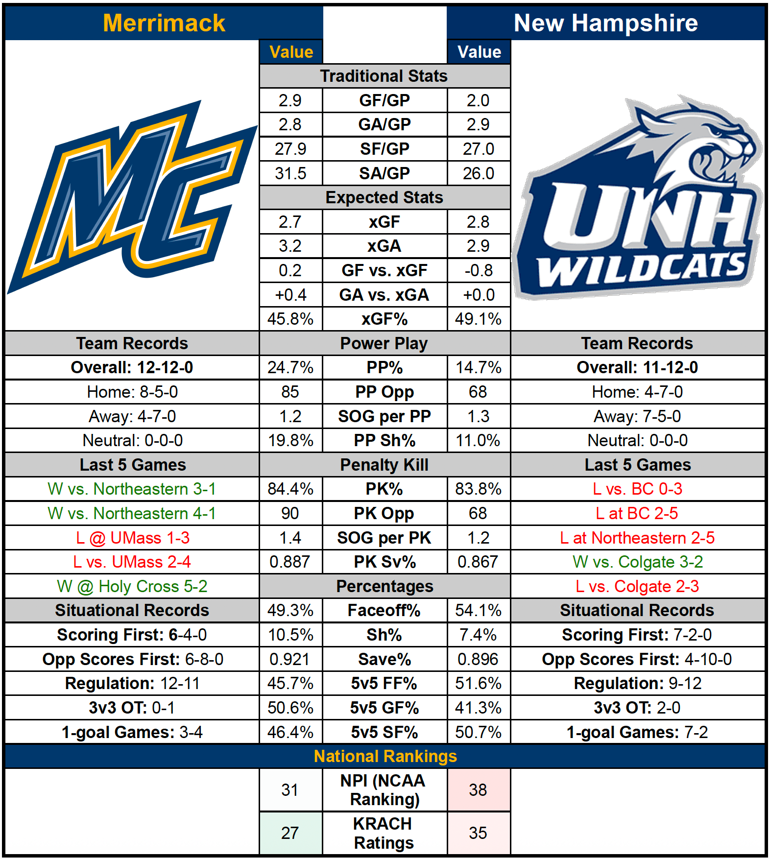 — New Hampshire leads the all-time series 75-31-12, but Merrimack has held a decisive edge in recent years. Since Jan. 22, 2021, the Warriors are 8-2-3 against the Wildcats and are unbeaten in the last four meetings (3-0-1) dating back to Feb. 3, 2024.