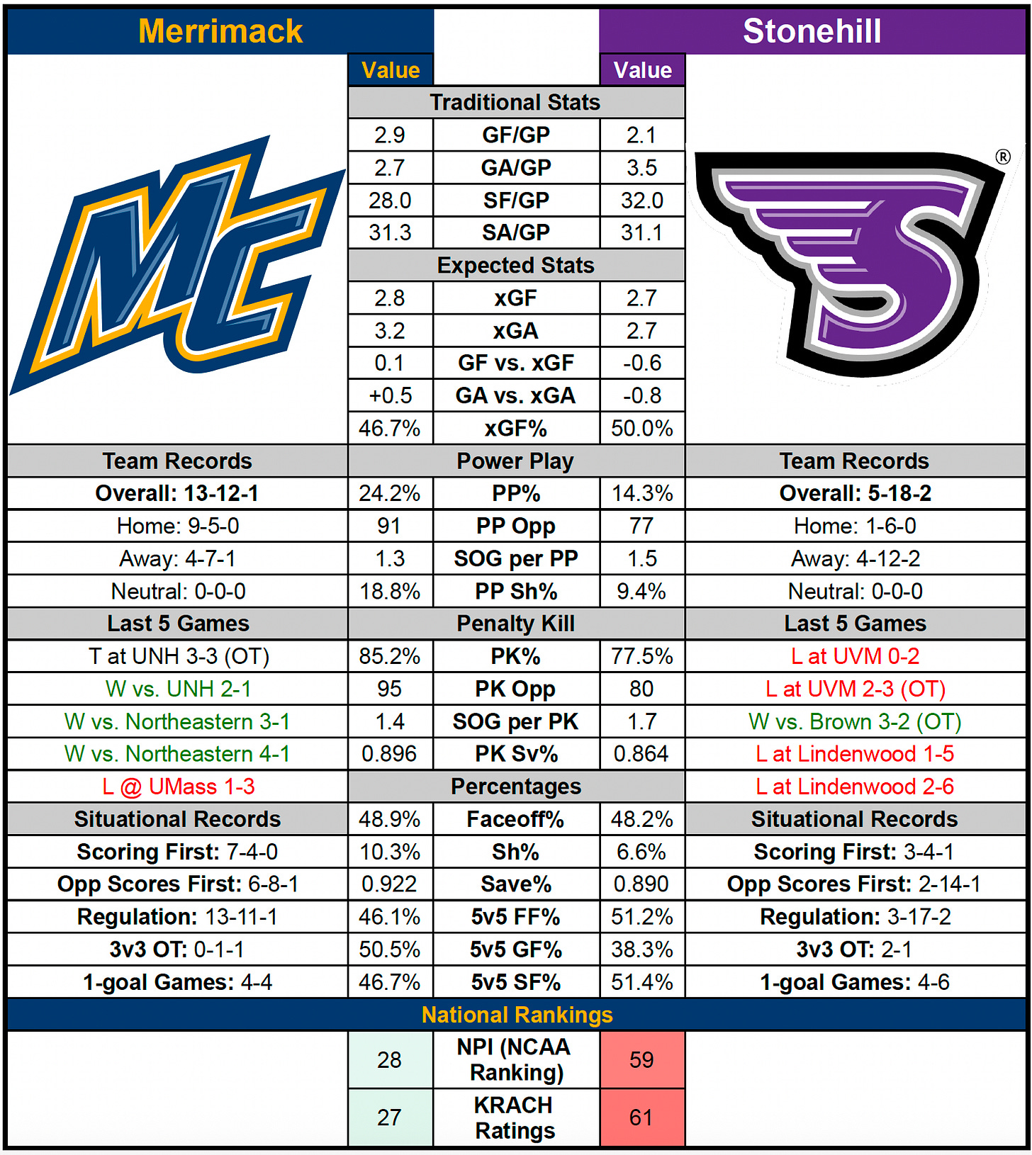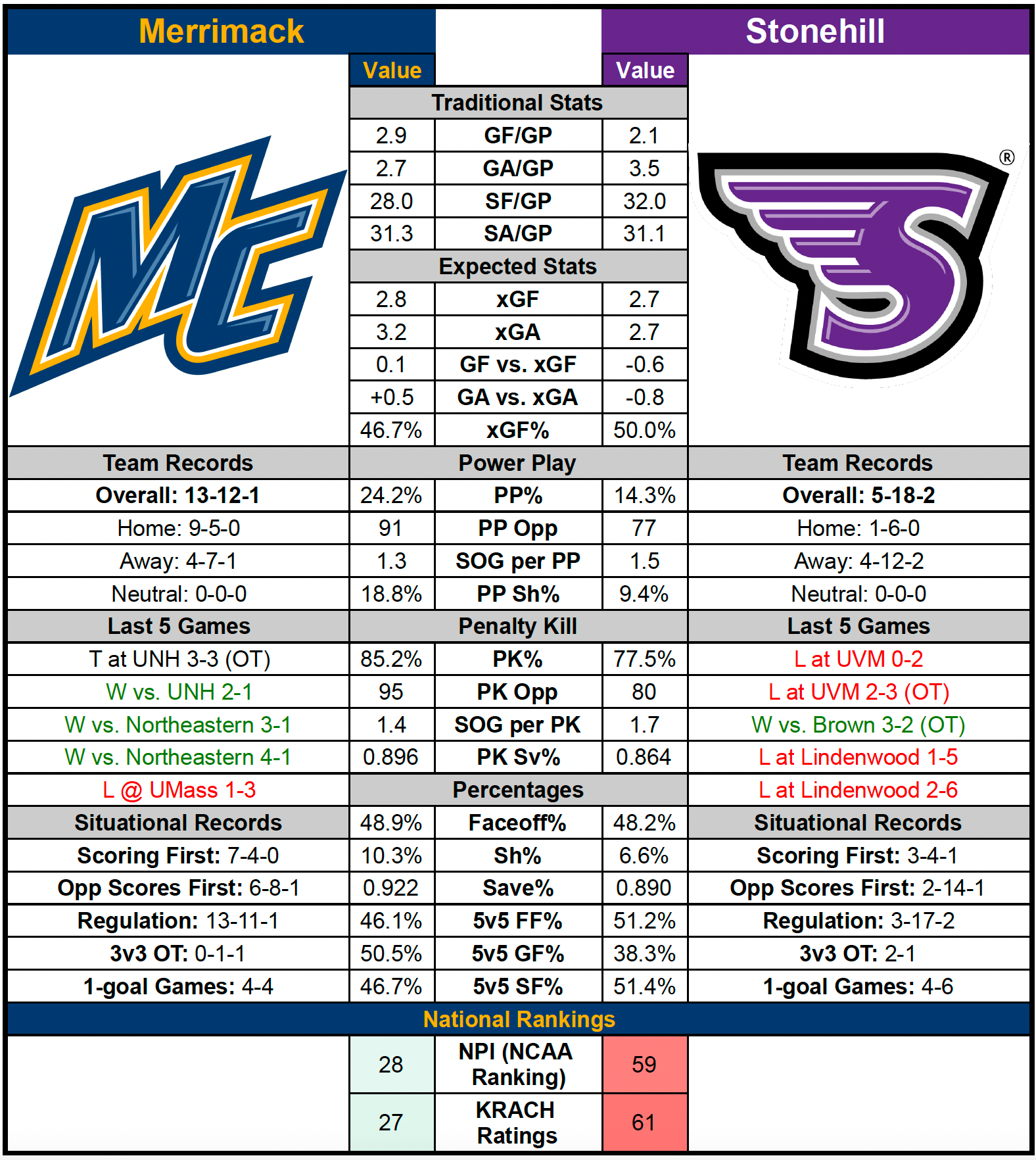 The matchup will be played at Warrior Ice Arena, the practice home of the Boston Bruins. Merrimack faced Stonehill in that building last season and came away with a 4–3 overtime loss, despite holding a commanding 44–19 edge in shots on goal.