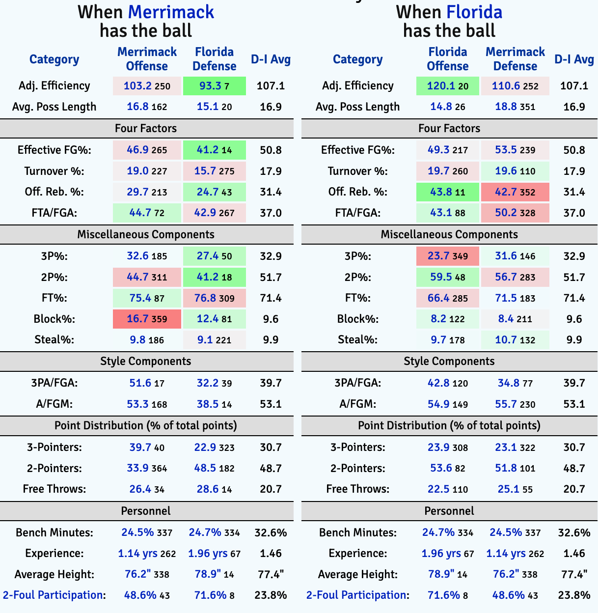 Merrimack is shooting 75.4 percent from the stripe, good for No. 87 in the nation. And while the Warriors’ defensive identity is rooted in forcing turnovers, Florida has shown some vulnerability there, ranking No. 260 nationally in offensive giveaways. If Merrimack can exploit that weakness — generating turnovers and converting them into points — that’s the biggest path to hanging around.