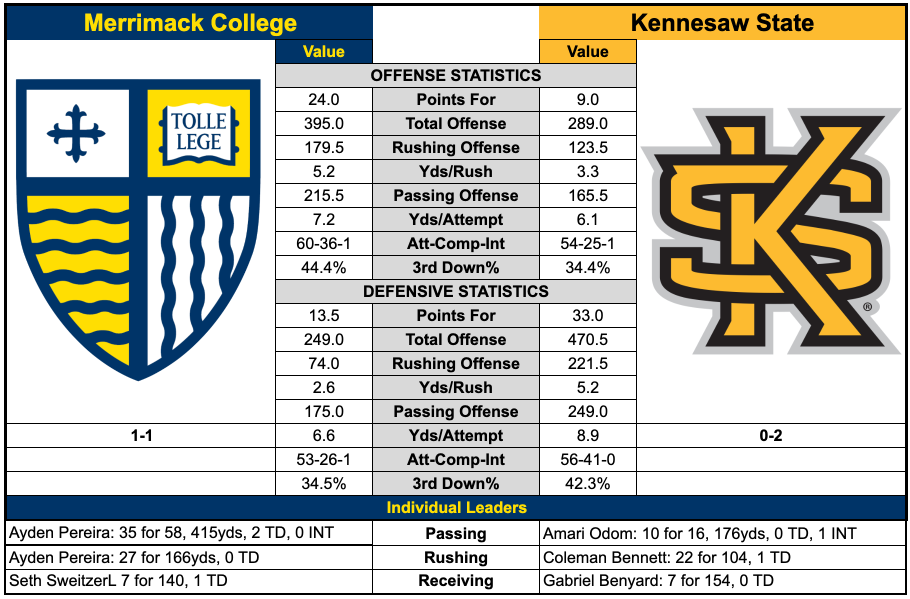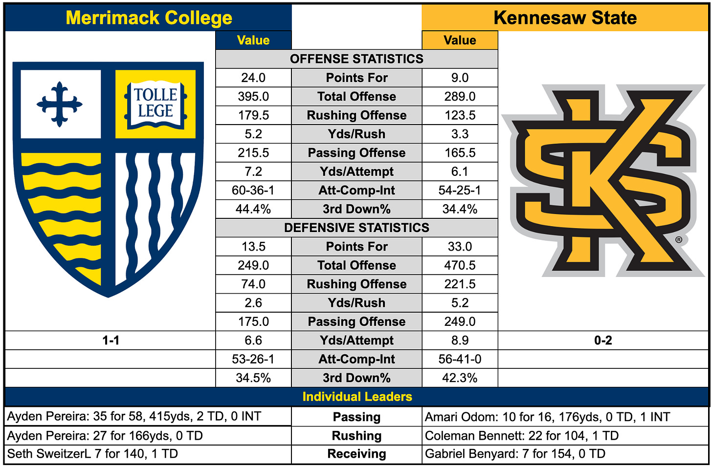 Merrimack hits the road this weekend for its second FBS matchup of the season, traveling to face Kennesaw State. The Warriors enter the weekend at 1-1 after handling Saint Anselm last Saturday.