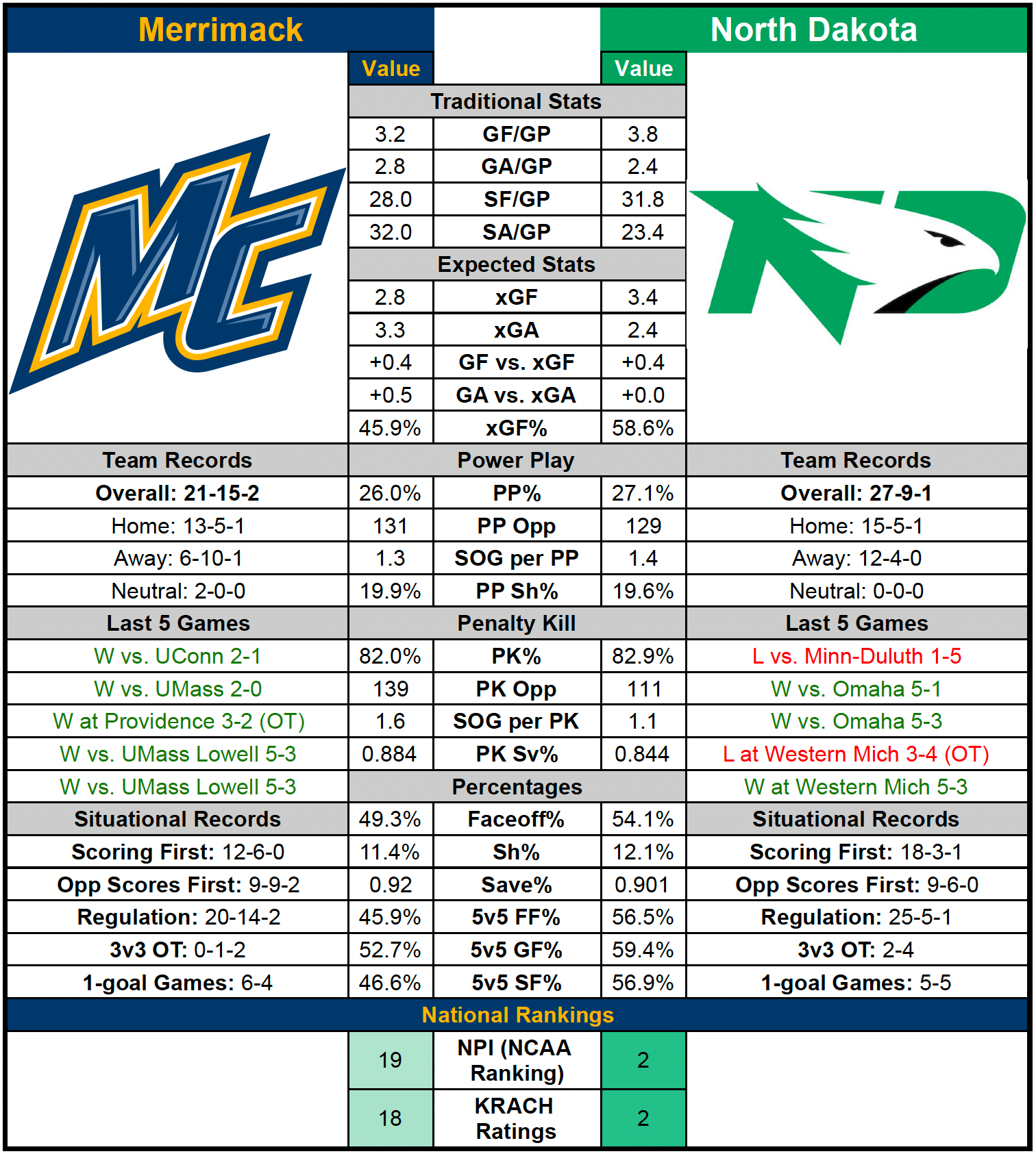 This will be just the third all-time meeting between Merrimack and North Dakota. The only previous encounters came at the outset of the 2009–10 season, when the Warriors were swept in a season-opening weekend series.