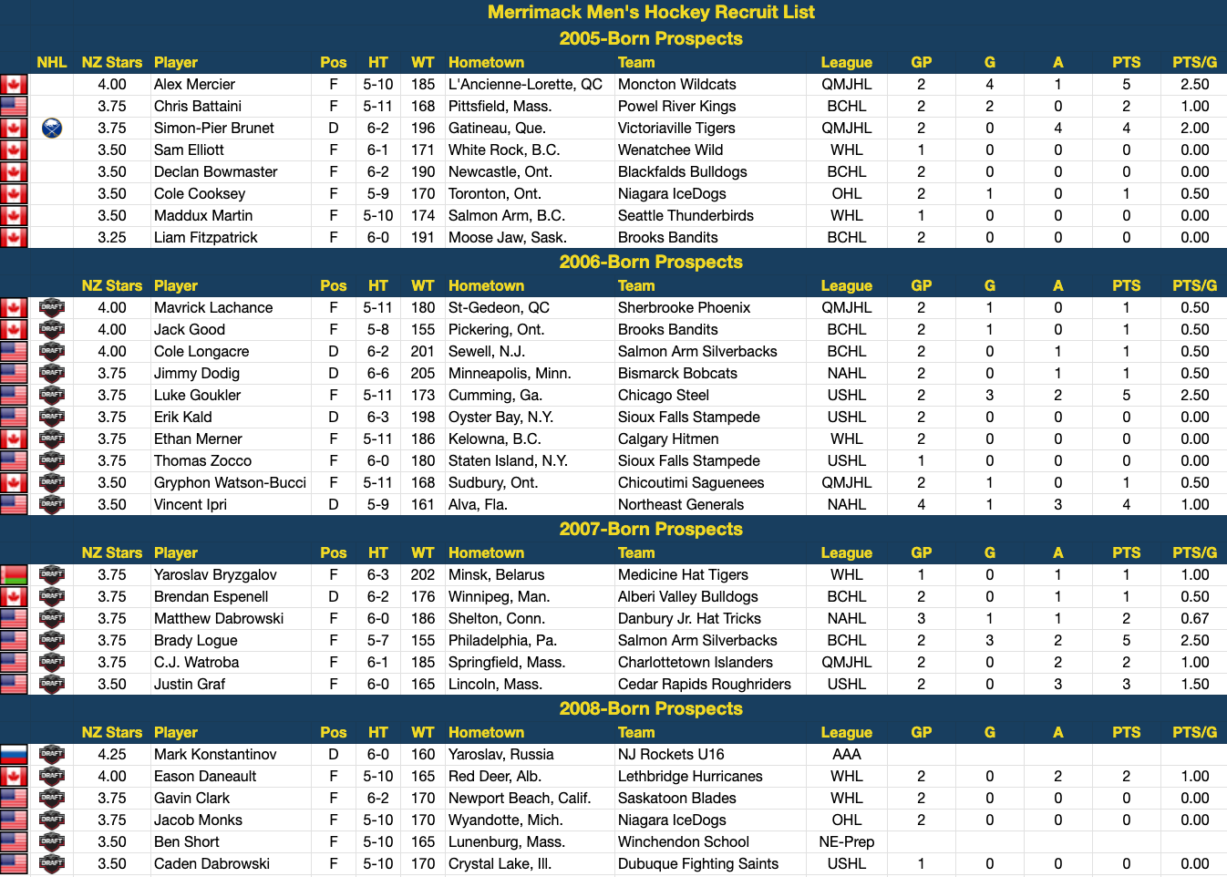 Alex Mercier paced the action with five points for the Moncton Wildcats (QMJHL) in a pair of games. Mercier is one of 13 Merrimack commits who will skate in the CHL this season. Luke Goukler turned heads with his five-point weekend for the Chicago Steel at the USHL Fall Classic.