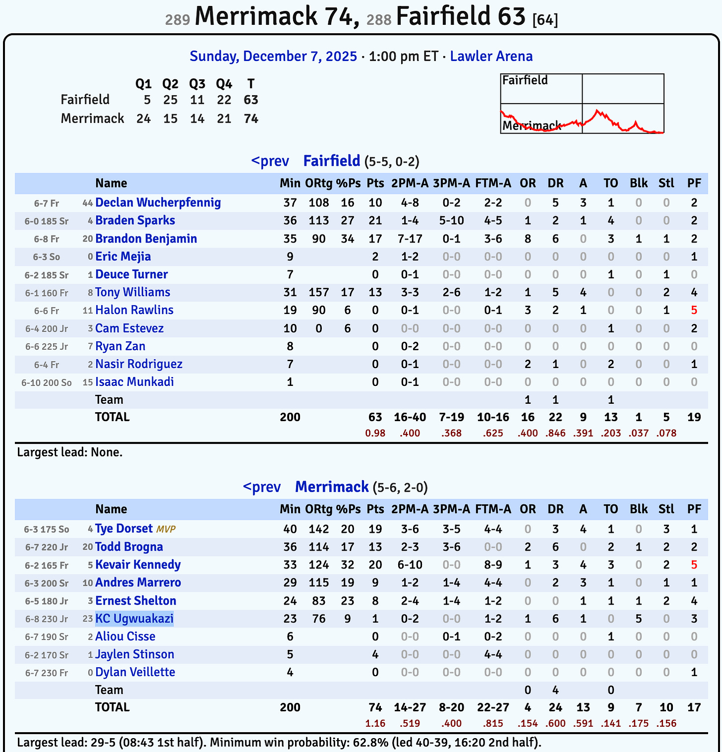 Merrimack 74, Fairfield 63