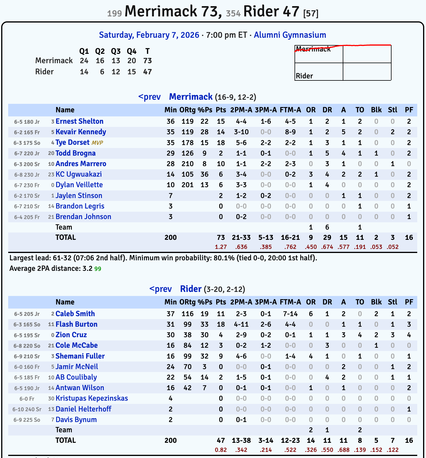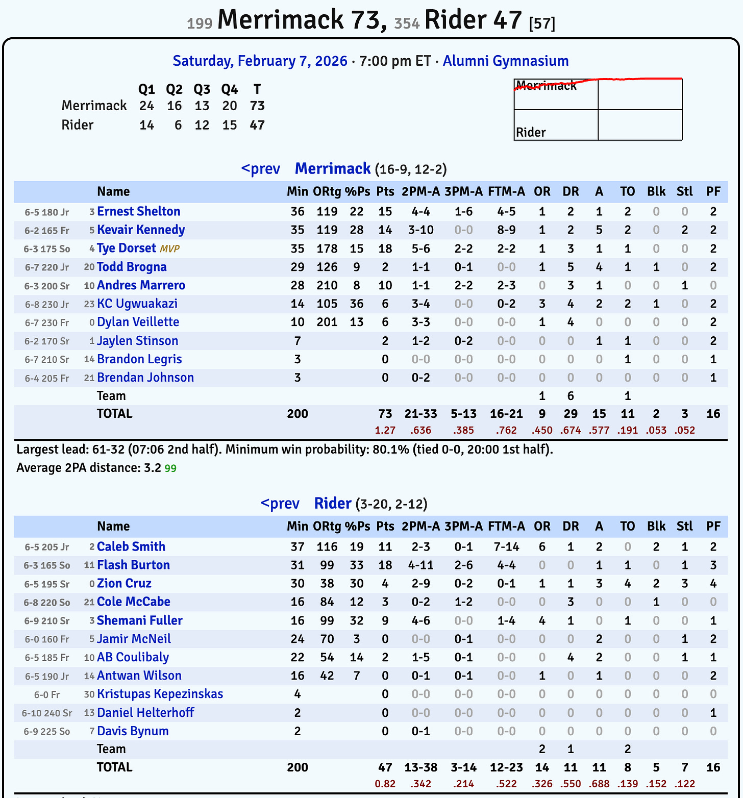 Tye Dorset scored 18 points as Merrimack rolled to a 73–47 victory over Rider on Saturday night.