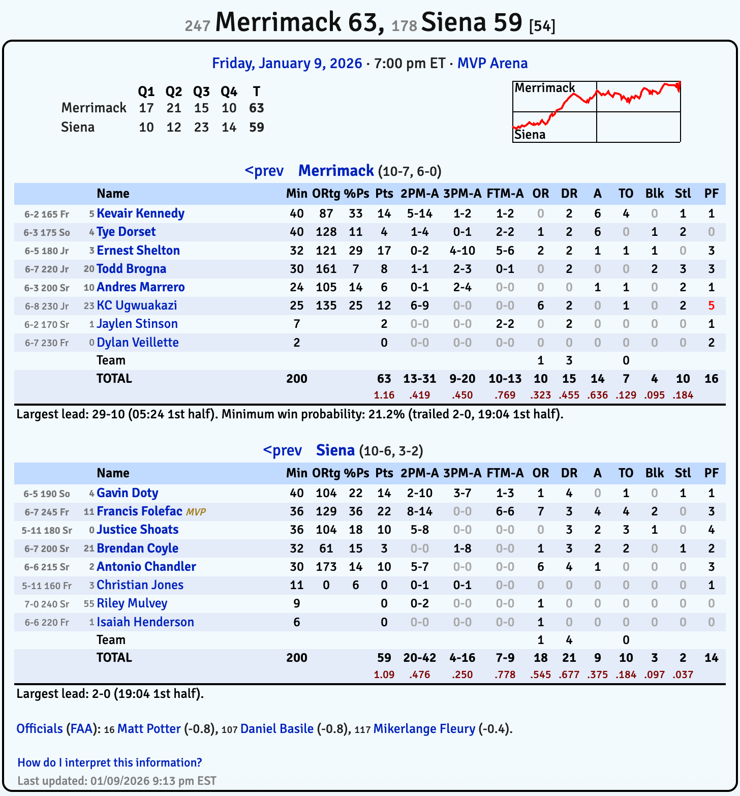 Ernest Shelton scored 17 points to help Merrimack hold off Siena 63-59 on Friday night.