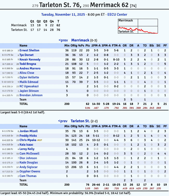 The Warriors had their own script flipped in this one. Tarleton State forced 10 steals and turned Merrimack over 21 times, a key flip as the Warriors normally win the turnover battle.