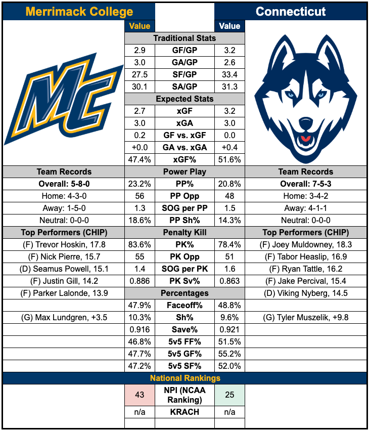 Merrimack opens a home-and-home series with UConn on Friday night at Lawler Arena. The Warriors dropped a 5-1 game to the Huskies last month, but that included a pair of empty-net goals.